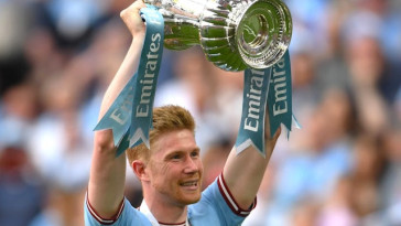 De Bruyne kemudian memainkan peran kunci dalam kampanye kemenangan Piala FA City 2022-23, mencetak gol melengkung indah dari jarak jauh dalam kemenangan 3-0 di putaran kelima di Bristol City sebelum memberikan dua assist dalam kemenangan 6-0 atas Burnley di perempat final, dan kedua gol voli ikonik Ilkay Gundogan dalam final Piala FA derby Manchester pertama (kemenangan 2-1 untuk City atas Manchester United).